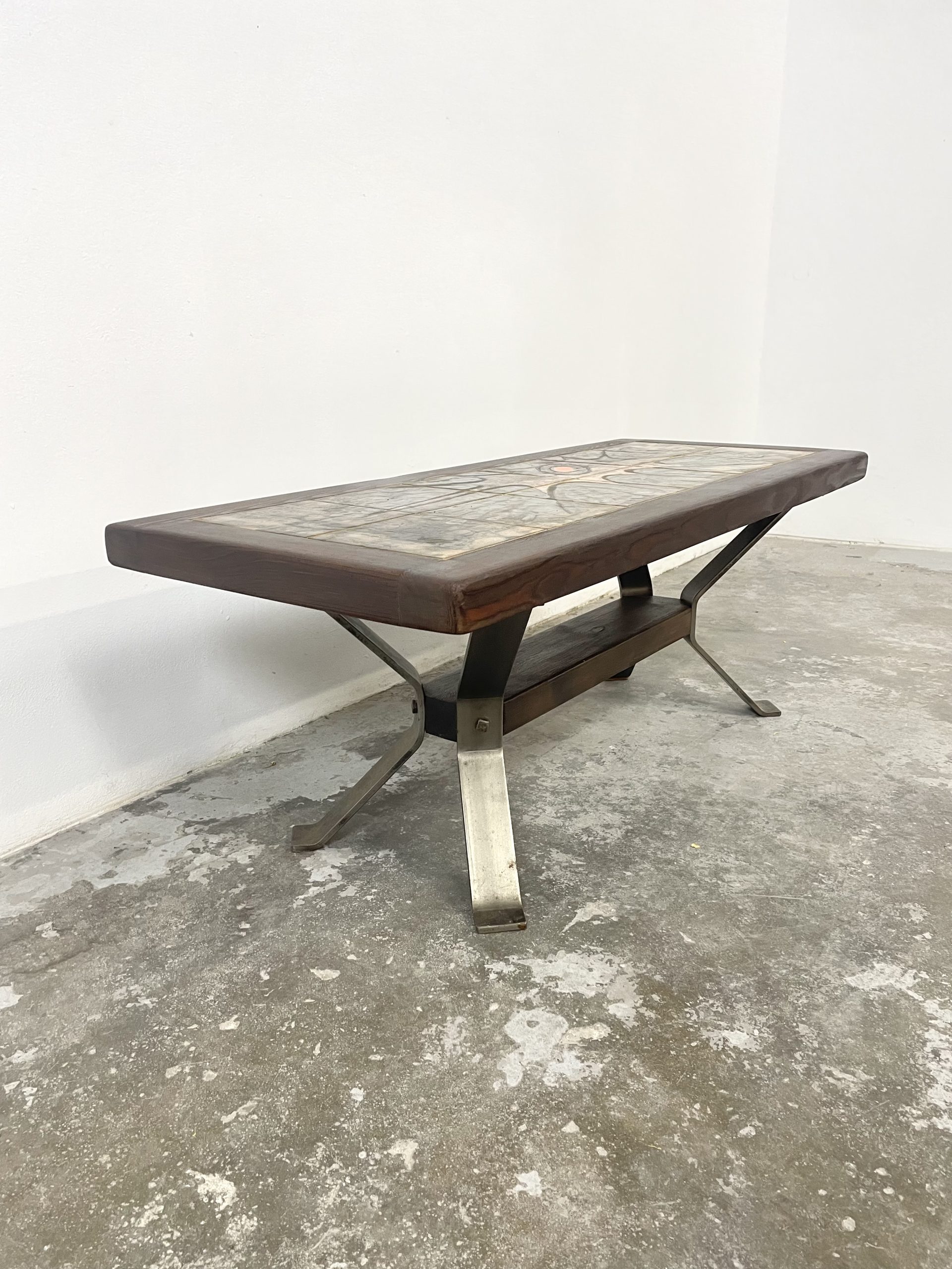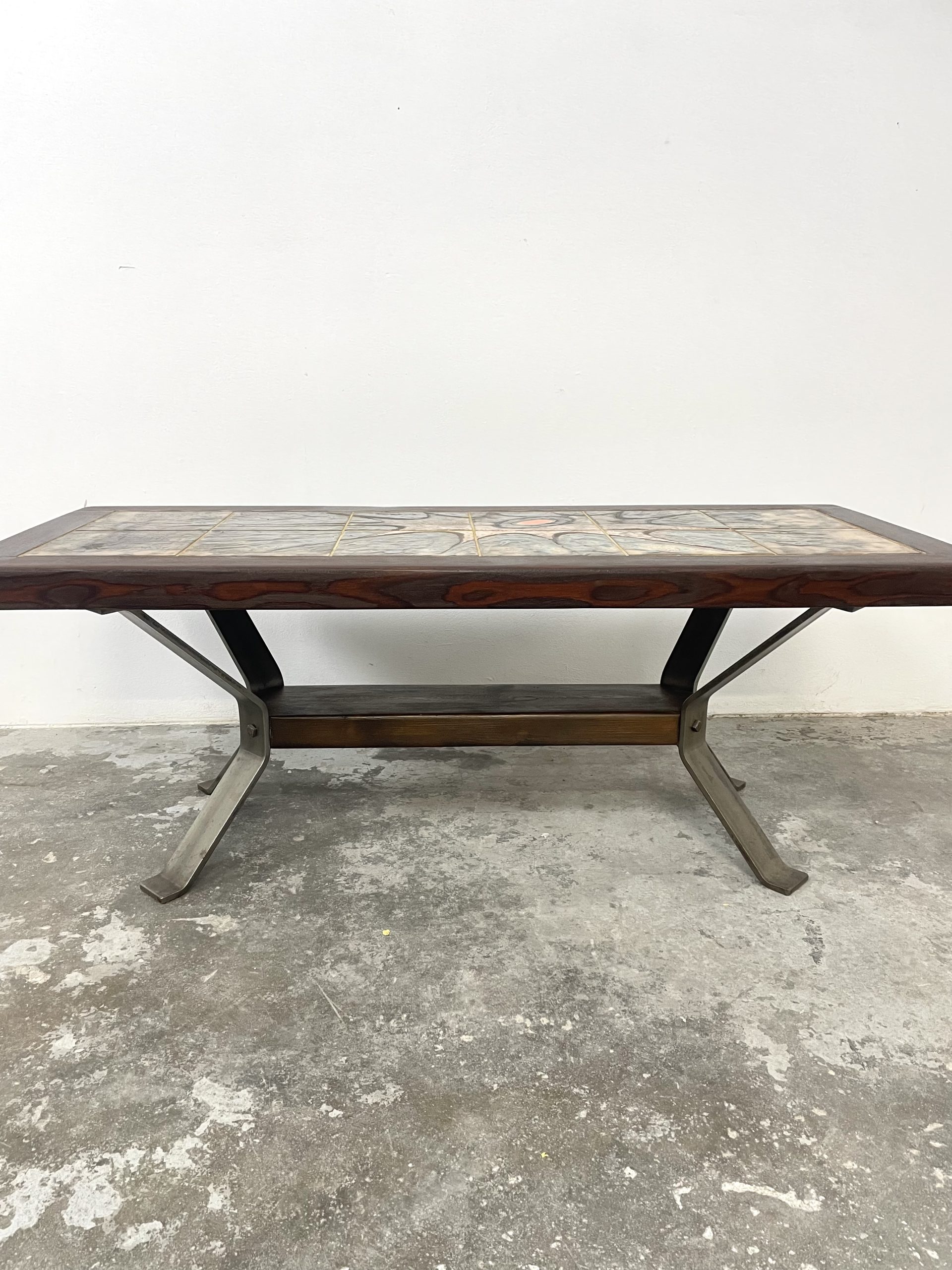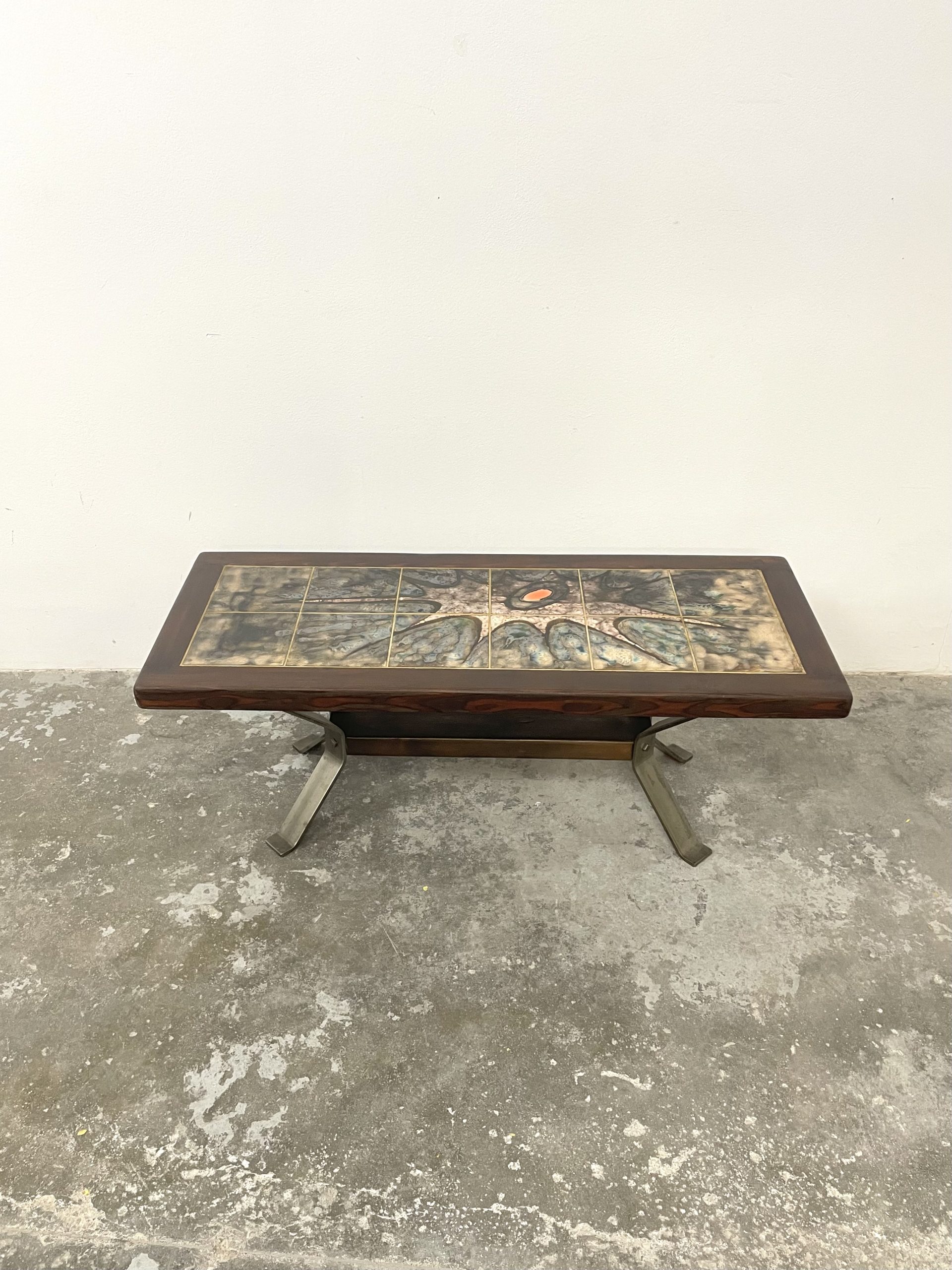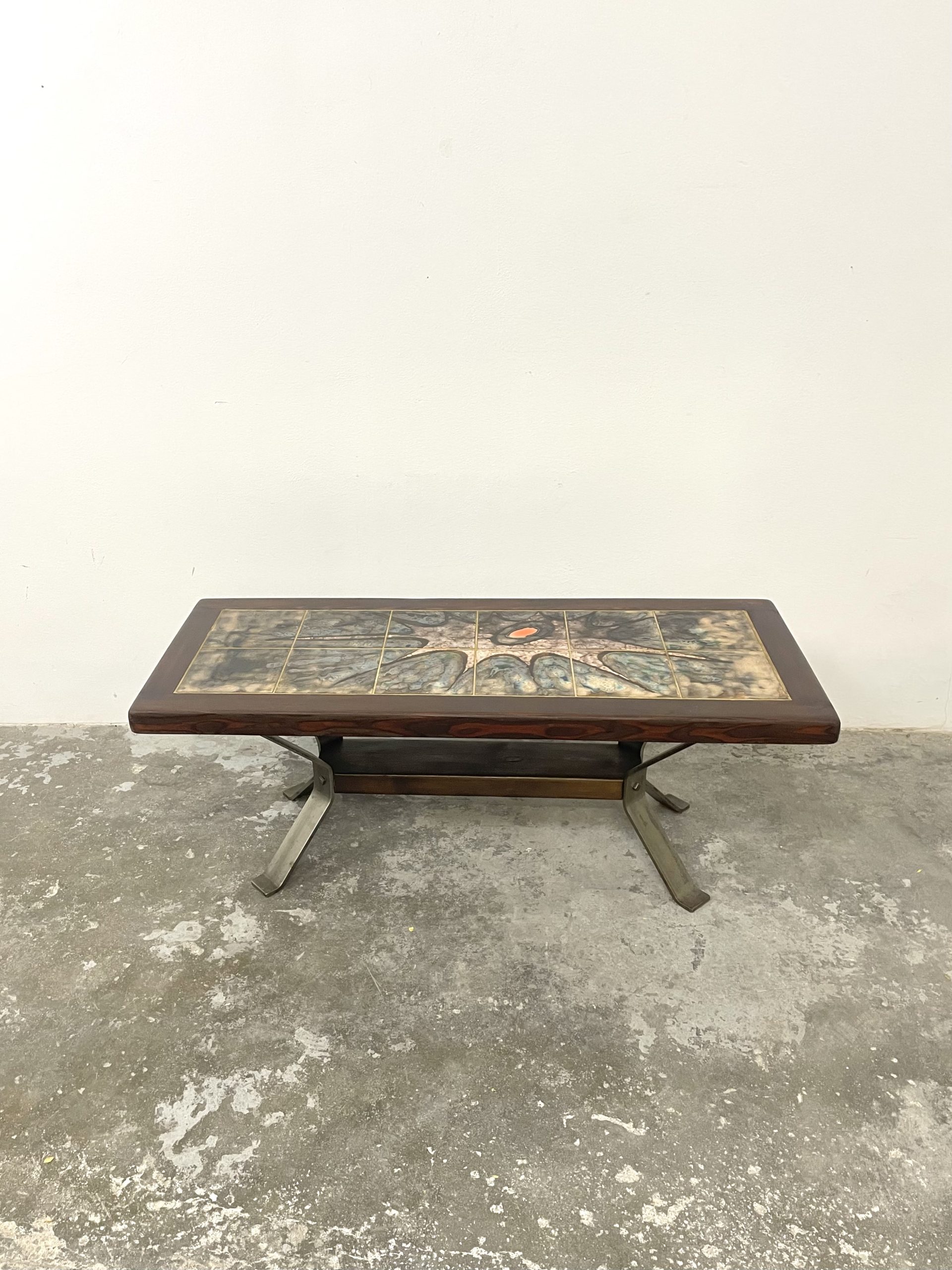 Estupenda mesa de centro, en hierro fundido, madera y cerámica.